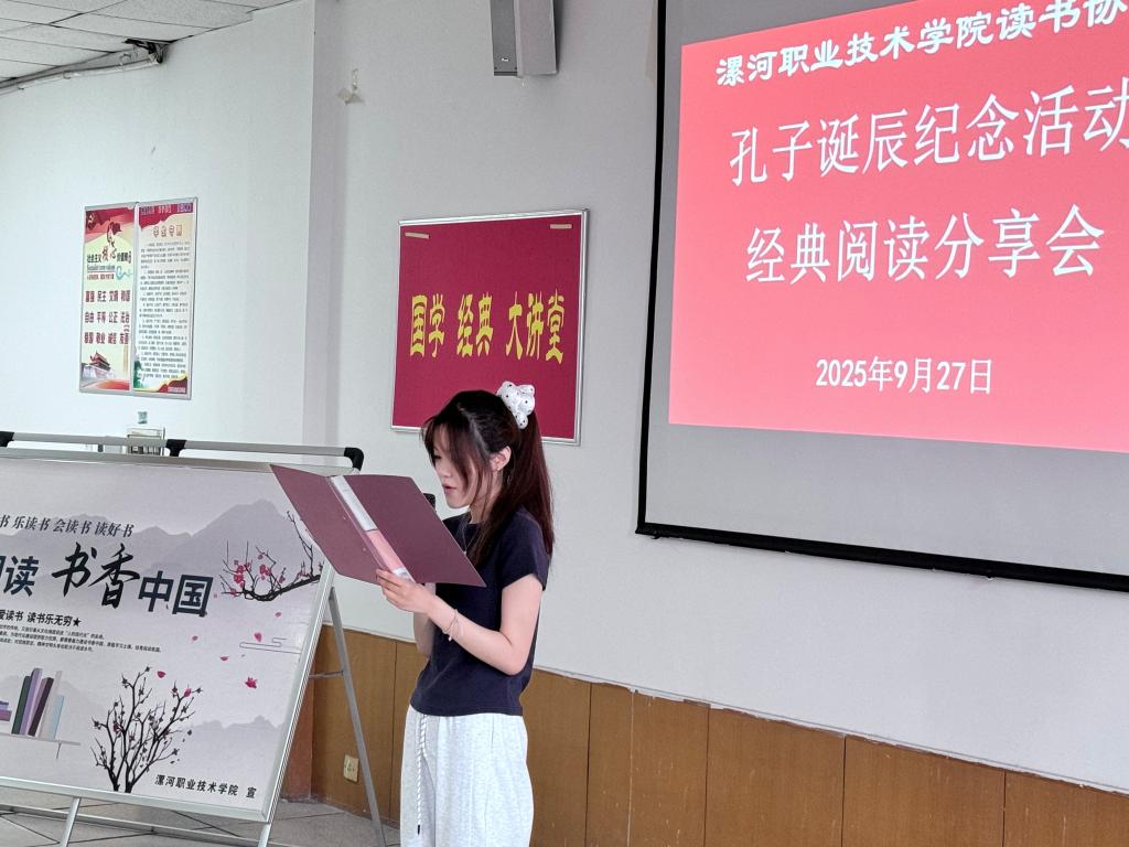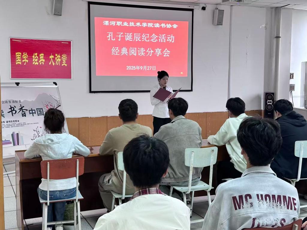为纪念至圣先师孔子诞辰2576周年,弘扬中华优秀传统文化,营造书香校园的浓厚氛围,2025年9月27日下午,以“传承经典,尊师重道”为主题的国学经典阅读分享会在我校图书馆四楼讲堂成功举行。本次活动由漯河职业技术学院图书馆和校团委共同举办、读书协会组织,吸引了来自各院系的百余名师生踊跃参与。