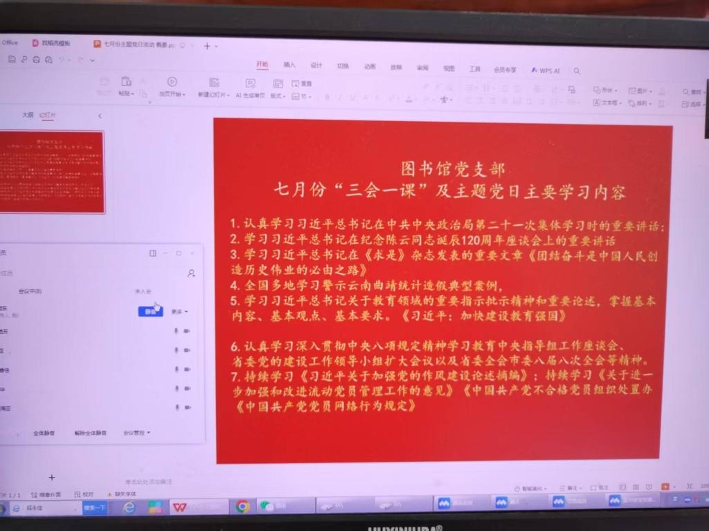 按照学校党委统一部署,7月28日,图书馆党支部以线上线下相结合的形式开展7份“三会一课”和主题党日活动。