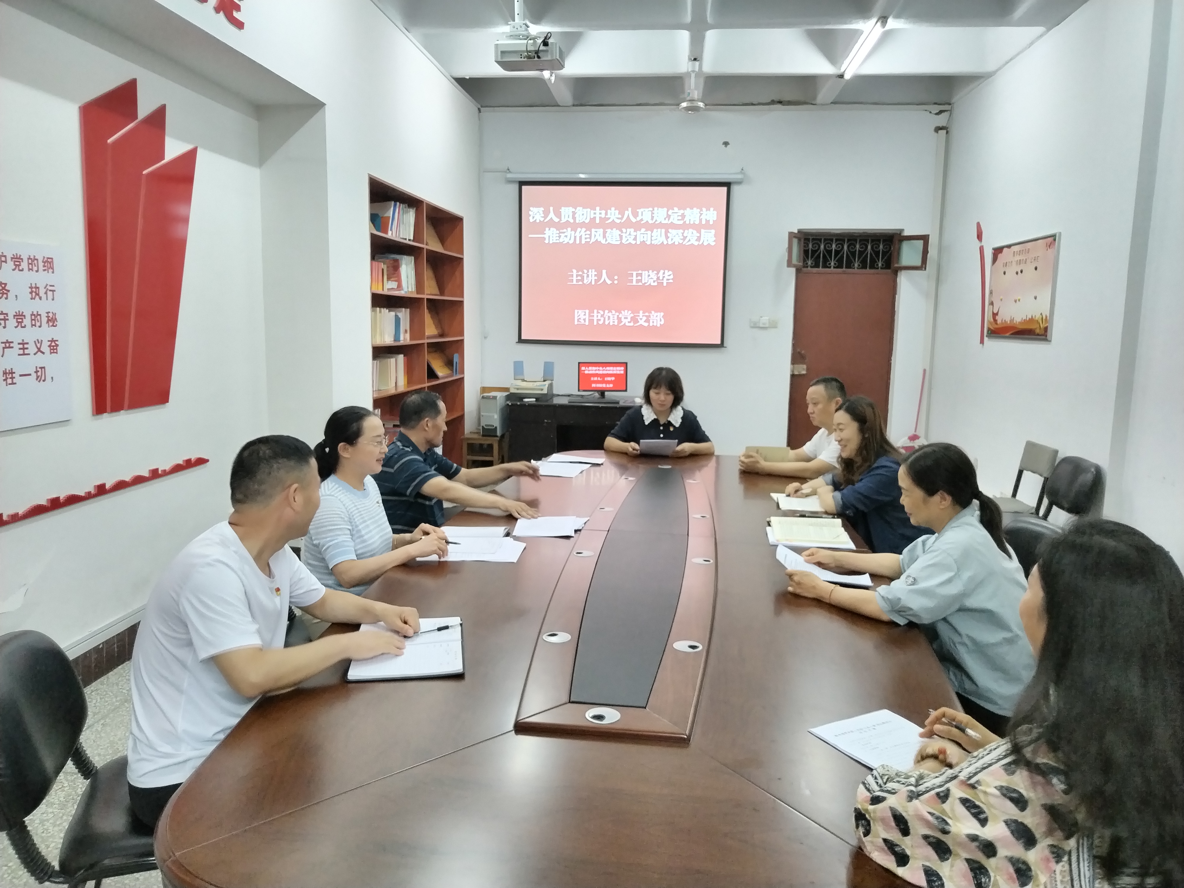 活动环节:一是开展庆祝建党104周年系列活动。党员们举行庄严的宣誓仪式,重温入党誓词,铭记初心使命;党支部书记围绕党的光辉历程和伟大成就,为党员讲专题党课,激发党员的爱党情怀。二是开展专题党课活动。“七一”前,党支部书记围绕深入贯彻中央八项规定精神学习教育,联系思想和工作实际讲专题党课,重点讲学习习近平总书记关于加强党的作风建设重要论述的收获感悟,讲贯彻落实中央八项规定精神的经验成效,以及违反中央八项规定精神的严重政治危害。通过以学促讲、以讲促学,引导党员们进一步增强贯彻落实中央八项规定精神的自觉性和坚定性。三是持续开展抓实党支部学习活动。组织党员认真学习《党的十八大以来深入贯彻中央八项规定精神的成效和经验》等书籍,深入领会中央八项规定精神实施以来取得的显著成效和深刻变化。四是围绕“深入贯彻中央八项规定精神的成效和经验”专题,组织党员对照警示教育案例剖析情况进行集体学习交流。班子成员发挥带头作用,进行领学和发言,每名党员也结合自身思想和工作实际,分享学习体会和感悟。五是持续开展警示教育活动,筑牢廉洁防线以发生在身边的违纪违法问题为生动教材,开展针对性强、实效性高的警示教育活动。通过深入剖析典型案例,引导党员们深刻反思自身存在的问题,对查摆出的问题进行再反思、再起底,动态更新问题清单和整改任务,扎实推进整改整治工作,筑牢廉洁自律的思想防线。六是持续开展“立足岗位作贡献”活动,践行使命担当。图书馆党支部把开展“立足岗位作贡献”活动与全省“‘学查改’一体推进进乡村、进企业、进网格”专项行动,以及“双承诺”“双报到”“双结对”活动紧密结合起来。引导党员立足图书馆行业领域和自身岗位职责,通过承诺践诺、志愿服务等方式,积极担当作为,为师生提供更加优质、高效的服务,在服务群众中践行初心使命。